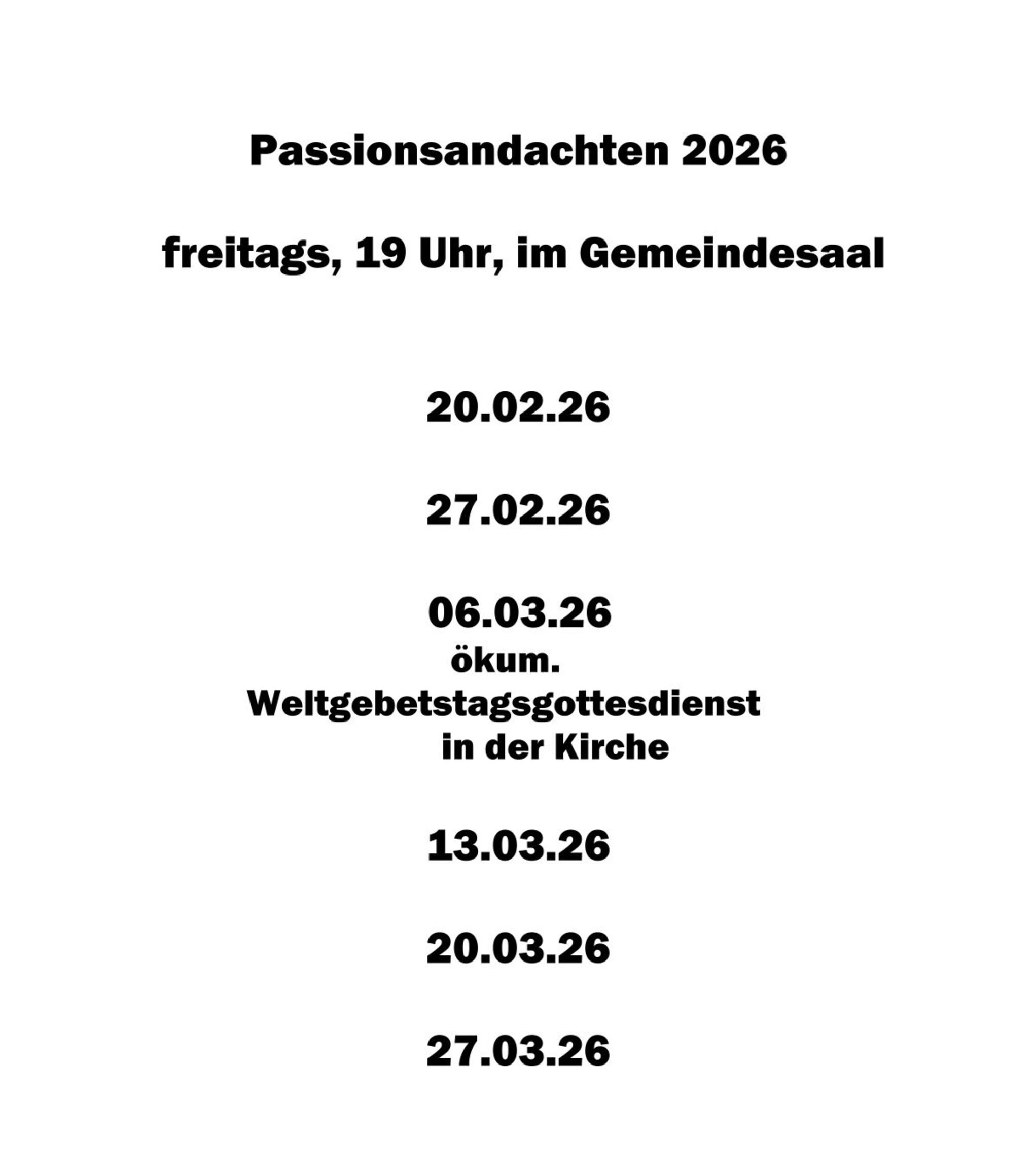 Nächste Gottesdienste Fr, 20. Februar 2026 Passionsandacht So, 22. Februar 2026 Invokavit Fr, 27. Februar 2026 Passionsandacht Terminübersichtsseite