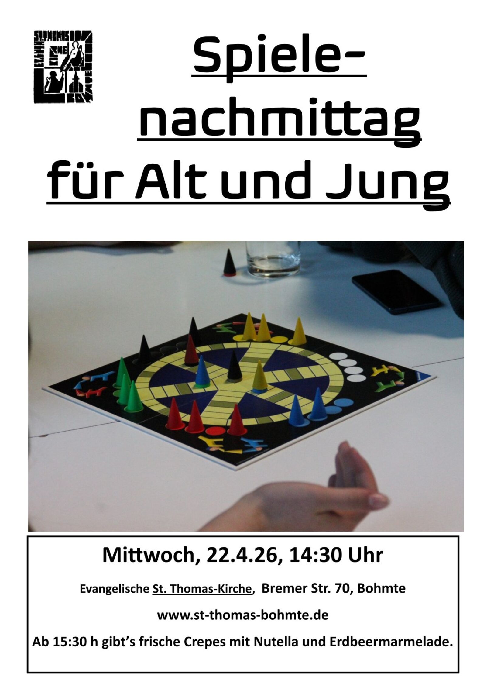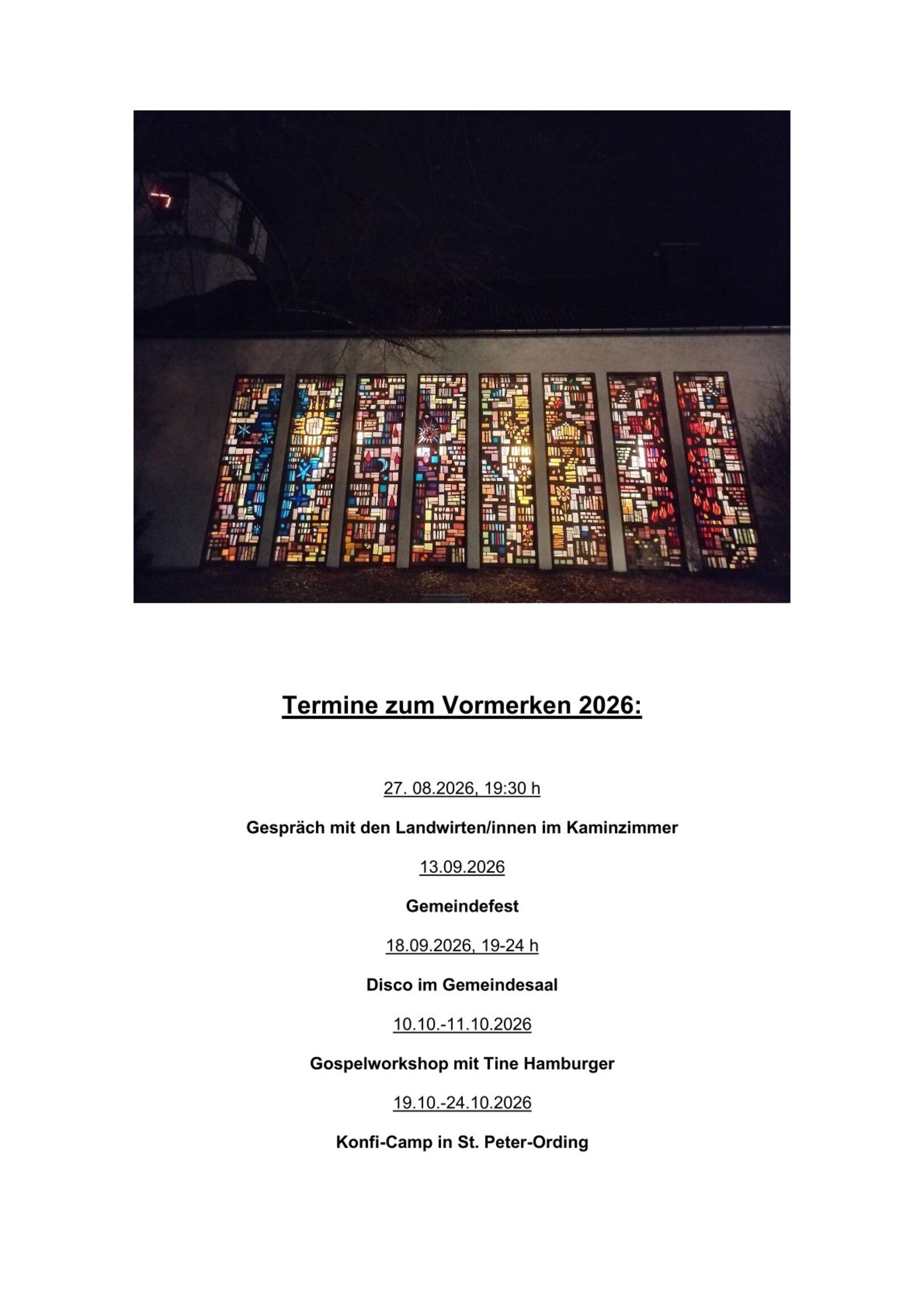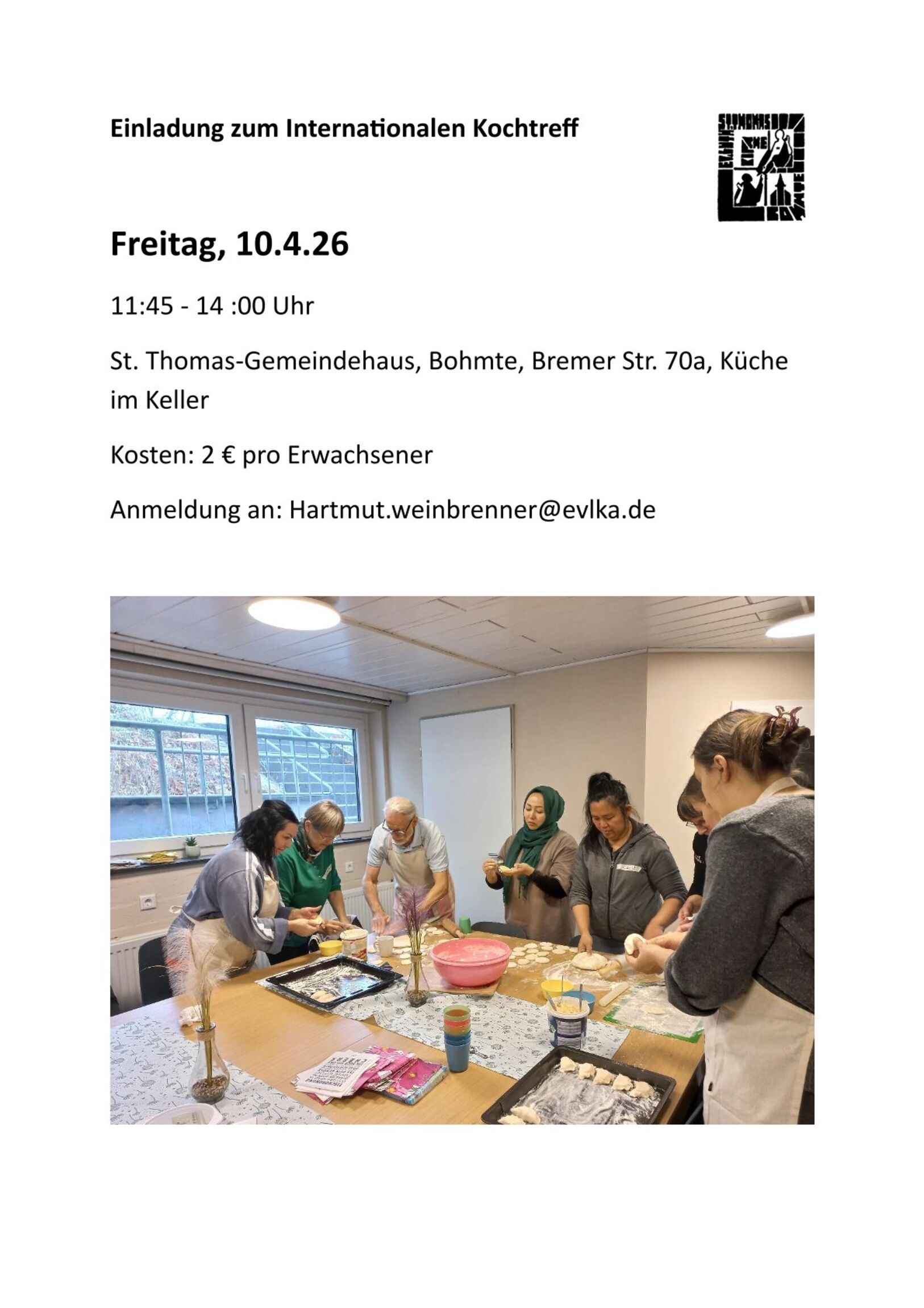 Veranstaltungen Fr, 10. April 2026 Internationaler Kochtreff Sa, 16. Mai 2026 "Gut gegen Nordwind" 29. — 30. Mai 2026 Gospelworkshop Terminübersichtsseite