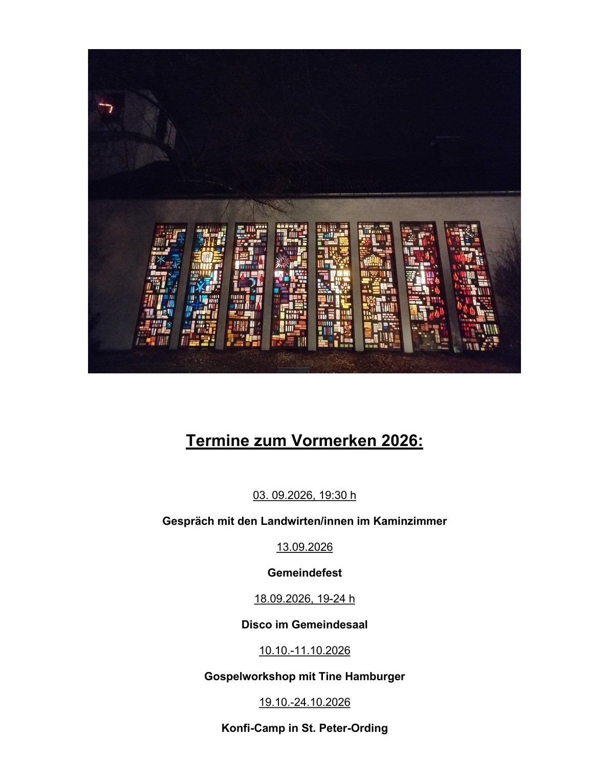 Nächste Gottesdienste Sa, 14. Februar 2026 Kindergottesdienst So, 15. Februar 2026 Estomihi So, 22. Februar 2026 Invokavit Terminübersichtsseite