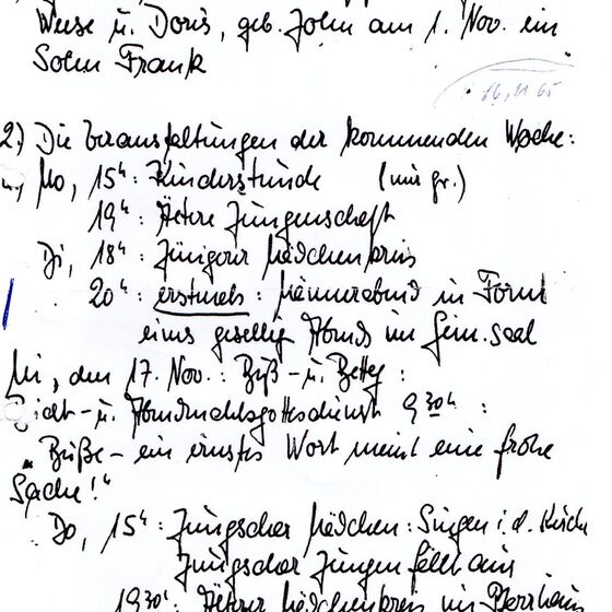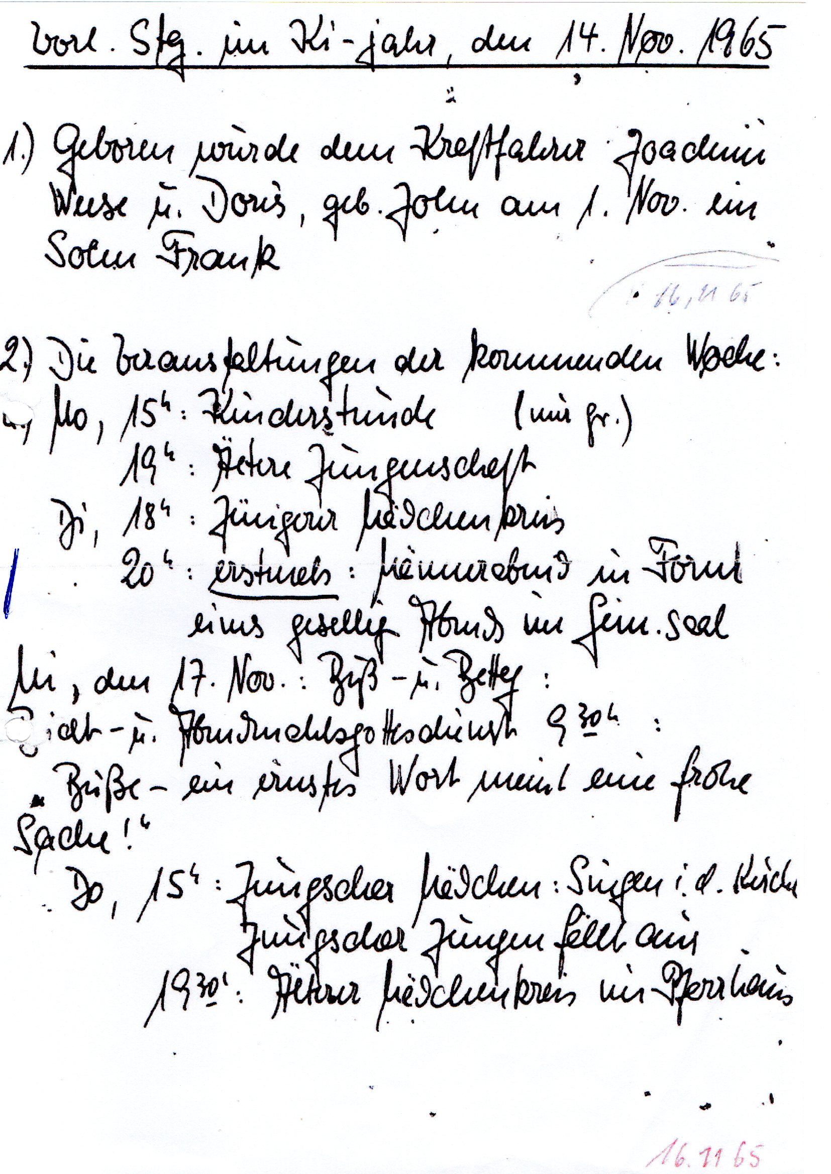 Der Männerkreis besteht im Jahr 2025 sechzig Jahre. Am 29.August 1965 wurde durch Pastor Schorege abgekündigt, dass die Gründung eines Männerkreises geplant ist. Durch die KV Wahl (damals im Herbst) und dem Urlaub des Pastors fand der erste Männerabend am Dienstag (Tag vor Buß- und Bettag) dem 16. November 1965 statt. Im weiteren Verlauf waren die Männerabende am Mittwoch. Da aber einige Fußballbegeisterte unter uns waren und Pokalspiele mittwochs stattfanden, wurde der Montag ausgewählt.