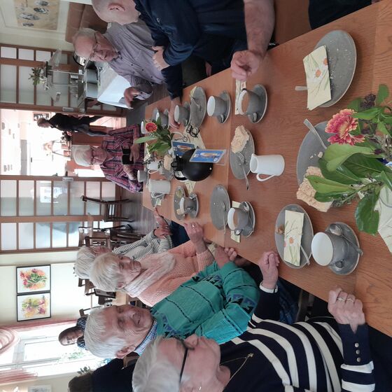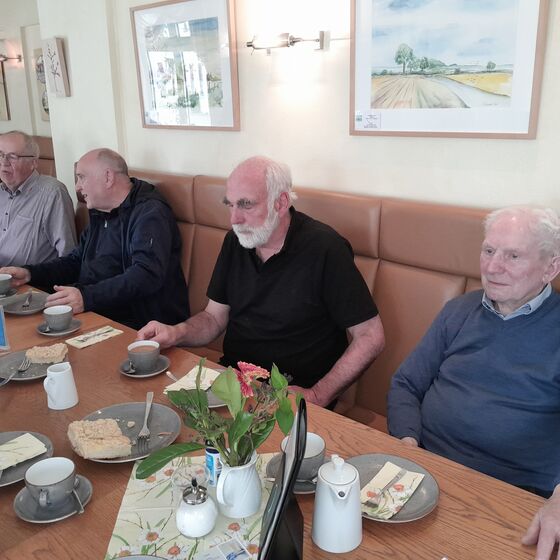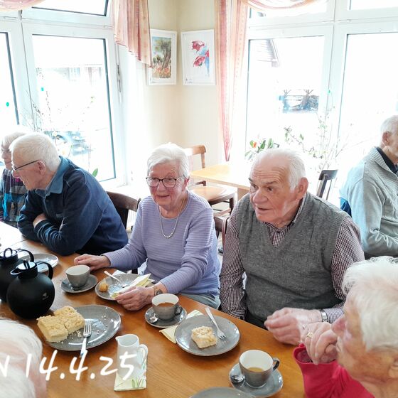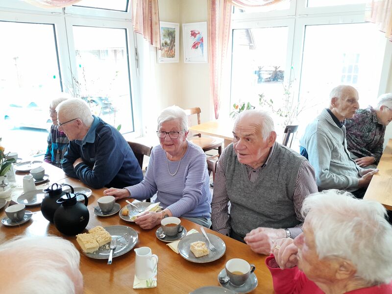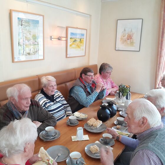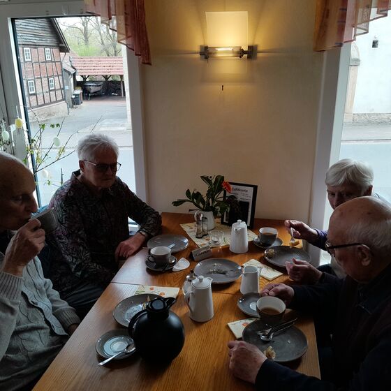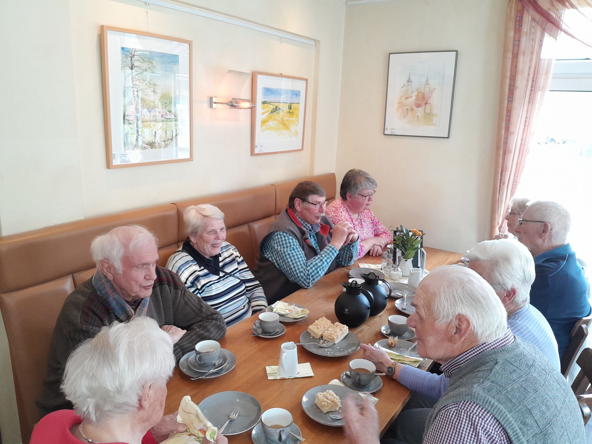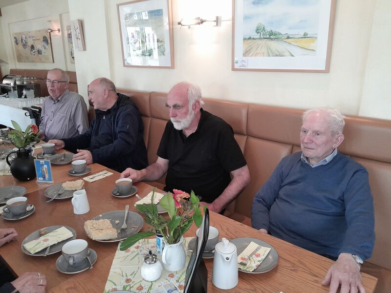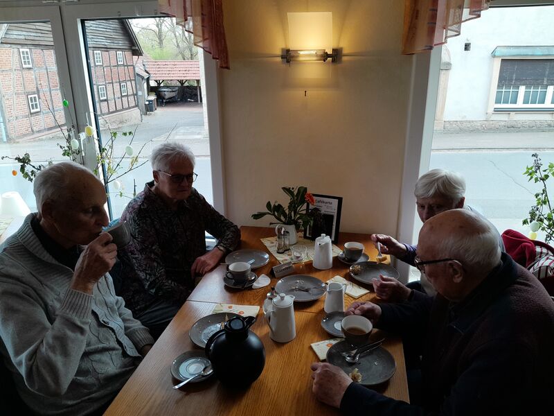 Mit wenigen Schritten erreichten wir das auf gegenüberliegenden Straßenseite Cafe Steuwer. An der Tortentheke konnte sich jeder ein Stück Torte aussuchen und sich an den reservierten Plätzen hinsetzen. Auf den Tischen war für jeden noch ein Stück Streuselkuchen und Kaffee satt vorhanden.