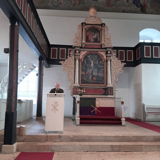 Platzmiete. Sehenswert ist das kassettenbemalte Deckengewölbe. Über dem Altar ist die Bergpredigt in einem großen Gemälde dargestellt. Diesem sehr ausführlichen Vortag wurde mit einem Präsent und Applaus gedankt.