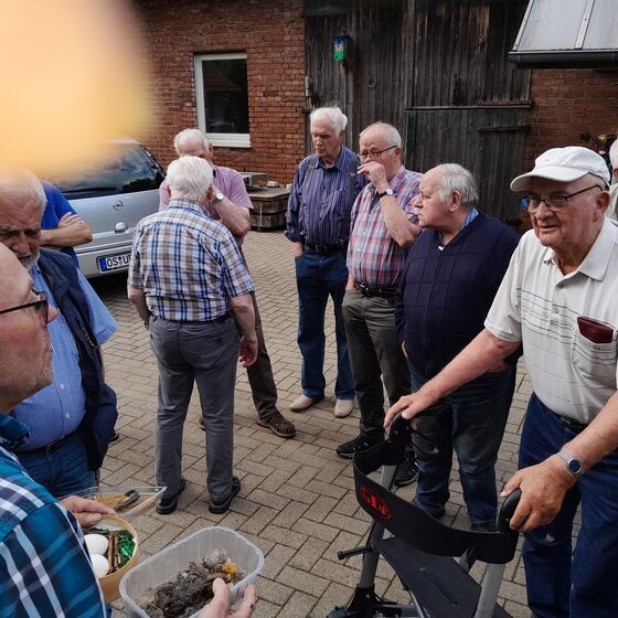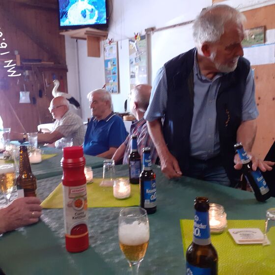 Um 16:30 Uhr trafen wir uns am evangelischen Gemeindehaus um in Fahrgemeinschaft zum Storchenhof Bick in Hunteburg zu fahren. Um 17:00 Uhr waren alle zur Stelle. Von Familie Bick wurden wir herzlich begrüßt. Da das Wetter zum Verweilen an der frischen Luft einlud, standen alle auf dem Hof und konnten die Störche beobachten. Auf der Diele war alles sehr einladend gedeckt. Grillmeister Helmut hatte seinen Grill schon angezündet und der Duft der Würstchen verleitete alle zum Platznehmen auf der Diele. Ernstfried hatte für die Getränke und Gläser gesorgt und auf den Tischen bereitgestellt. In einer Gedenkminute wurde unseres verstobenem Mitgliedes Günter Schnittker gedacht.Die fleißigen Helfer Walter A. und Ernstfried servierten alsbald die Grillwürstchen.