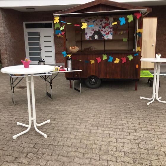Das Hüttenteam hatte die Thomas-Hütte vor der Friedhofskapelle abgestellt und Petra und Sabine hatten sie frühlingshaft dekoriert.